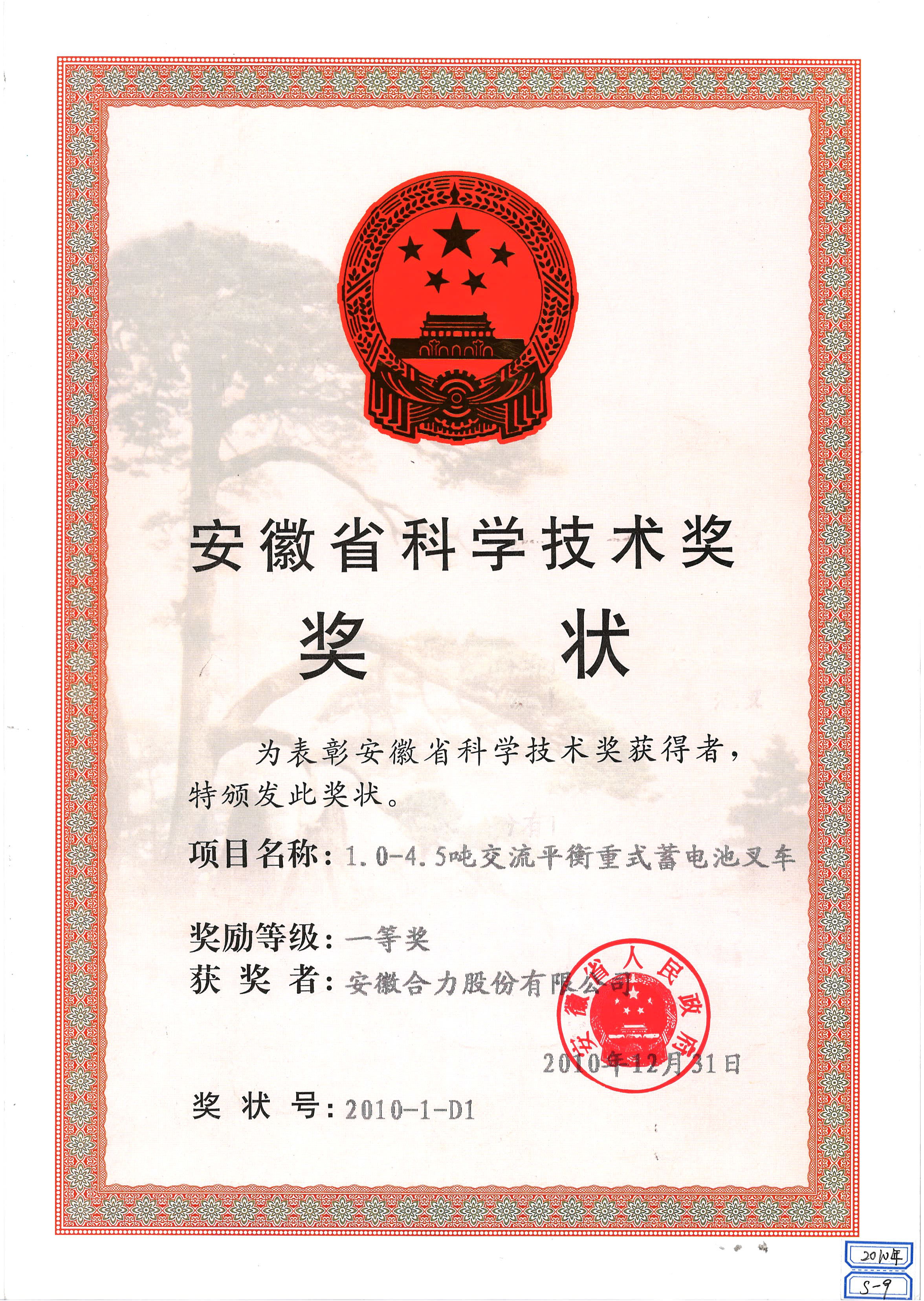 2010 安徽省科学手艺奖奖状:1.0-4.5吨交流平衡重式蓄电池叉车一等奖