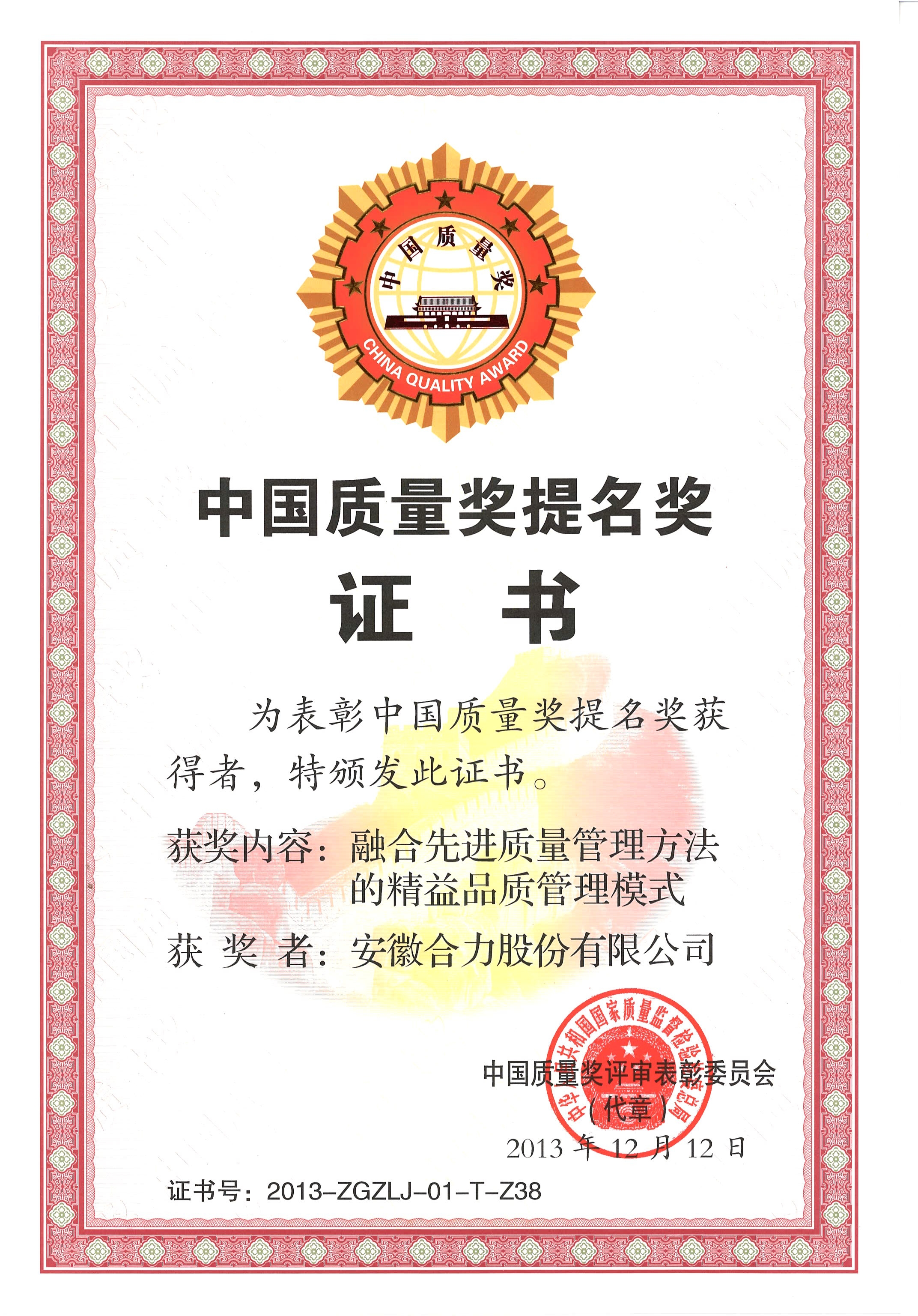 2013 中国质量提名奖