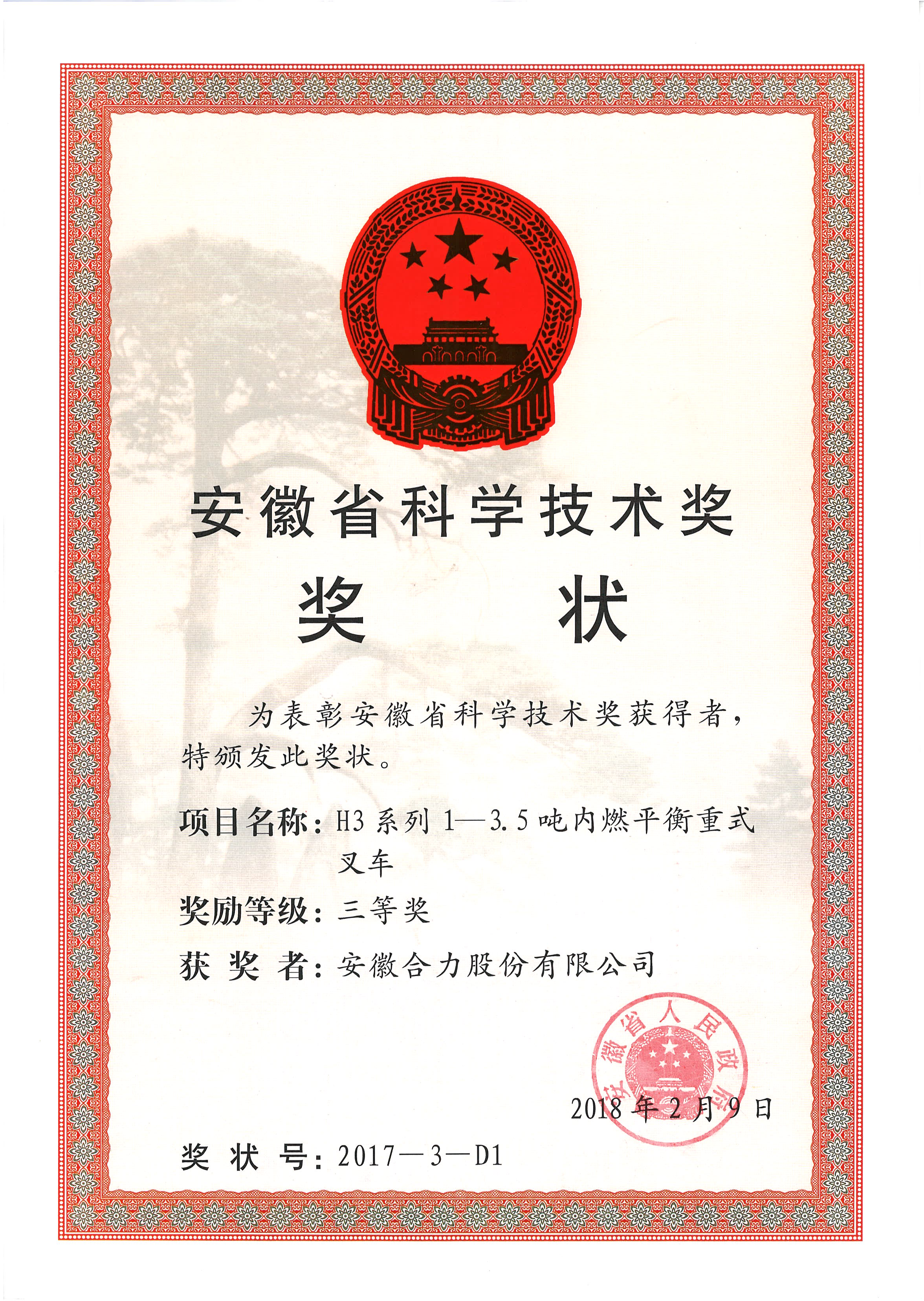 2018 安徽省科学手艺奖三等奖 H3系列1-3.5吨内燃平衡重式叉车
