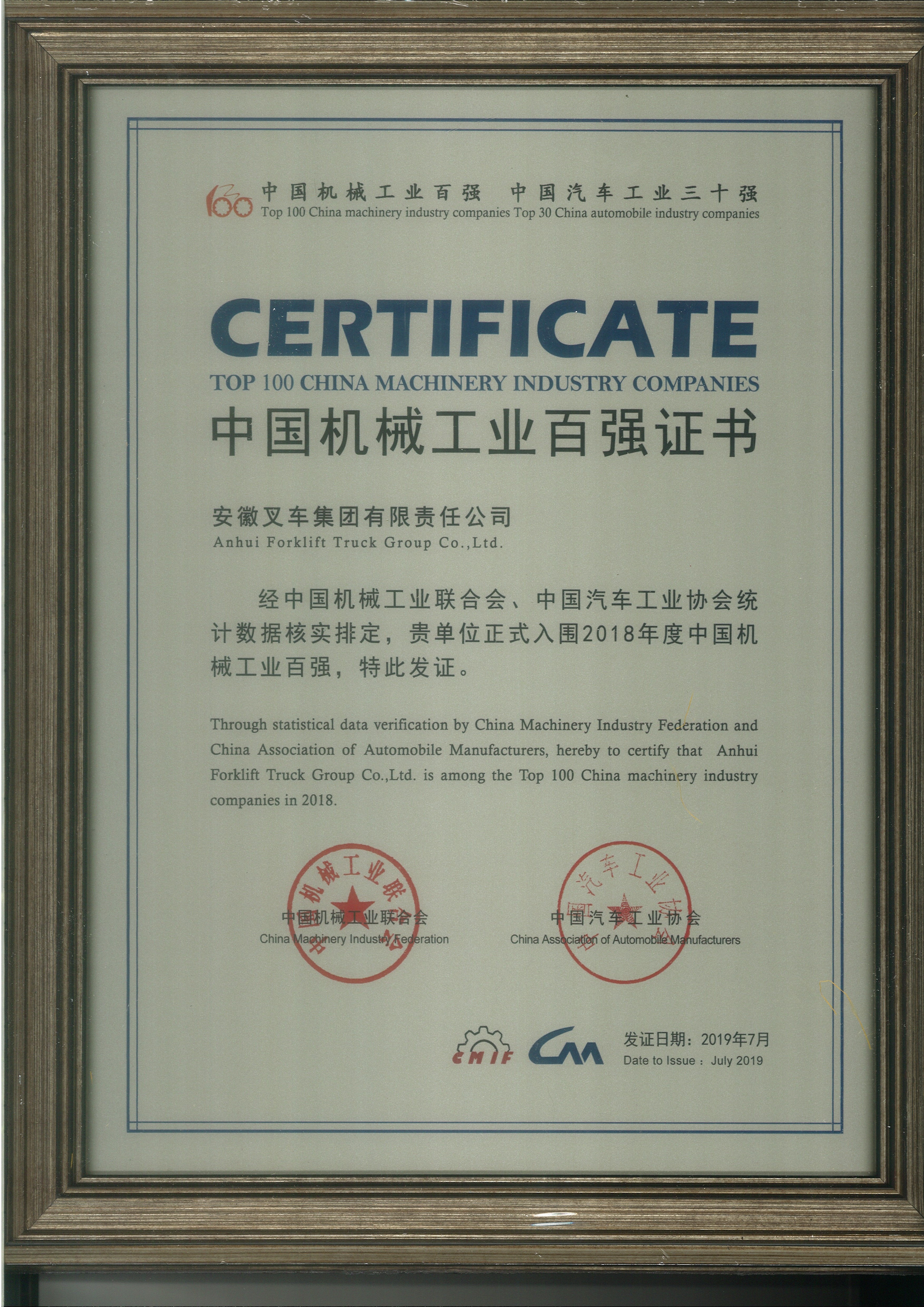 2020 中国机械工业百强证书